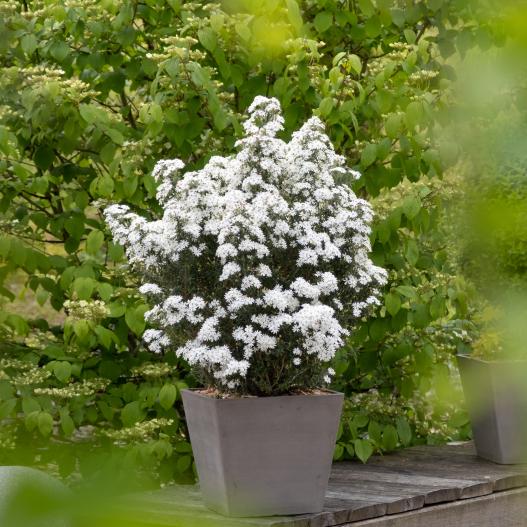 Ce petit arbuste très florifère au printemps couvre la totalité de son feuillage gris avec des fleurs blanches. Son port buissonnant lui permet de se faufiler dans tous les espaces. Peu gourmand en eau, il supporte les sécheresses passagères et se plaît en bac ou en pot.