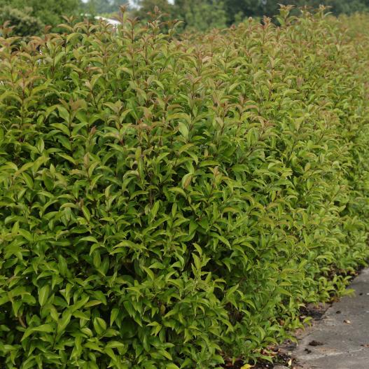 Ses jeunes pousses sont orangées puis deviennent rougeâtre en bordure sur des tiges rouges. Elle passent ensuite au vert franc et laissent apparaître des fleurs en grappes blanches très odorantes en été. Son port naturel globuleux facilite son emploi en haie comme en pot en solitaire.
