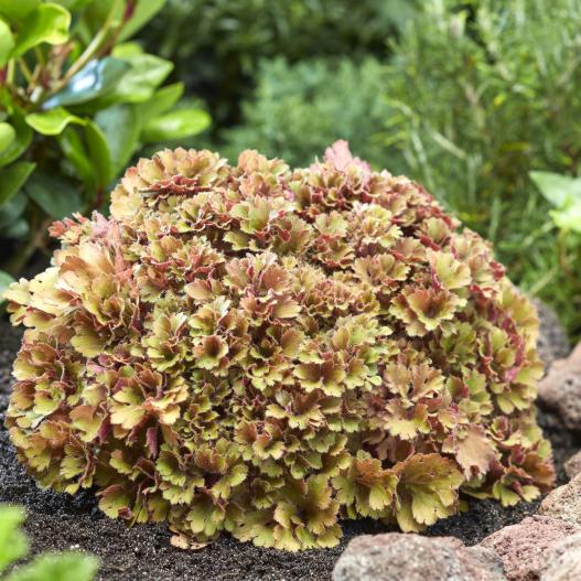 Son feuillage unique est composé de petits groupes de feuilles frisées qui forment des grappes et donnent un ensemble harmonieux. Sa couleur caramélisée s'accorde avec beaucoup de fleurs pour composer des potées ou des massifs.