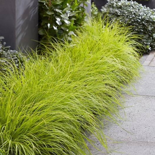 Lumen Gold présente un feuillage jaune au printemps qui évolue vers un vert tendre en été lors de la floraison. Cette petite graminée n'est pas exigeante et résiste naturellement au sec. Elle se place partout, au soleil comme à mi-ombre, en massifs au premier plan comme en pot ou en bac.