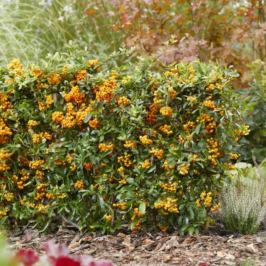 Le Pyracantha Sunny Star illumine le jardin avec ses fruits changeants, passant d’un jaune éclatant à un orange profond, évoquant une myriade d'étoile. Ses fleurs blanches printanières évoluent en une abondante fructification dès le plus jeune âge, idéale pour la biodiversité. Ce buisson résistant aux maladies et avec peu d’épines offre une expérience sans souci. Placez-le en plein soleil pour un maximum de couleurs automnales. Parfait en haie ou isolé.