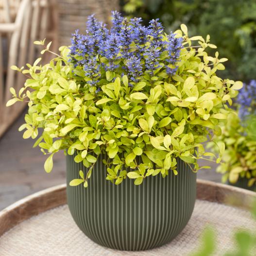 L'Ajuga Feathered Friends Cordial Canary est une version de la bien connue bugle, aux petites feuilles allongées couleur lime mordoré ! Une variété lumineuse qui porte au printemps des épis de fleurs bleu cobalt. Une vivace originale et colorée qui trouvera sa place dans un sol frais, à l'abri du soleil de l'après-midi.