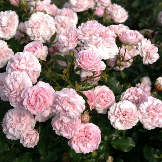 Les fleurs doubles en grappes sont nombreuses, rose porcelaine et blanc. Elles tombent seules lorsqu'elles sont fanées et donnent au massif un aspect toujours propre. Le feuillage est très résistant aux maladies et présente 9 mois de végétation. Le port est très couvrant, ce qui permet de le positionner partout, en massif comme en talus, en pot comme en bac.