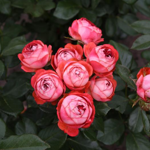 Les fleurs incroyables de Pompeji sont très doubles et de forme arrondie. Elles sont rouge-rosé et le revers des pétales est blanc-rosé, offrant un contraste intéressant. Son port compact et touffu le rend idéal en pot sur une terrasse ou dans un petit jardin.