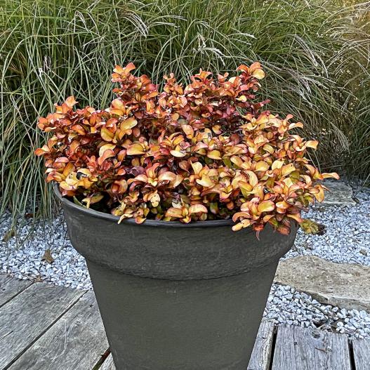 Feuilles rondes, coriaces et luisantes mêlant le jaune, l'orange et le vert. Ce cocktail acidulé rend cette plante lumineuse et gaie en toute circonstance. Elle sera à l'aise dans toutes les compositions aux couleurs chaudes. Sa forme naturelle buissonnante et compacte n'est pas exigeante en entretien. Avec ces qualités, cette plante trouve une place dans tous les types de jardins.