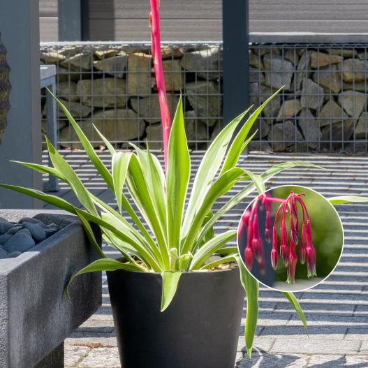 Le Beschorneria yuccoides Desert Glow est une plante vivace aux longues feuilles étroites rappelant le yucca. Elles sont de couleur vert glauque et marginées de crème. En été, de longues inflorescences rose vif apparaissent au cœur des rosettes et portent des fleurs vertes étoilées. Après la floraison, la plante se ramifie avec de nombreux rejets autour de la rosette principale. Moyennement rustique, le Beschorneria yuccoides Desert Glow nécessite un sol bien drainé et une exposition au soleil. La plantation dans le jardin est possible sur les régions côtières peu exposées au gel.