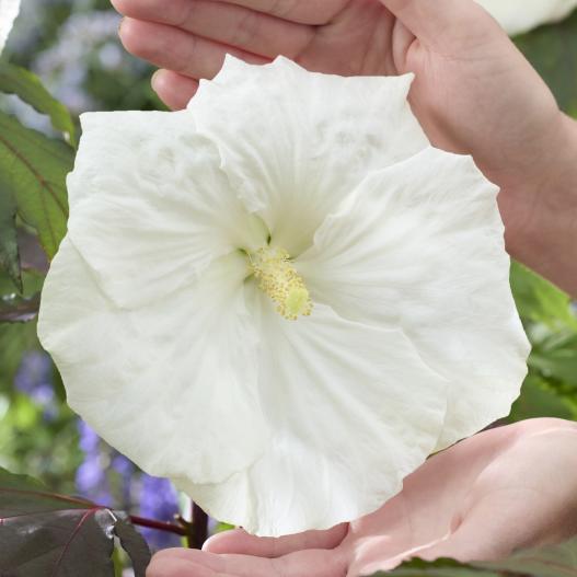 Laissez-vous envoûter par CAROUSEL® Ghost, un hibiscus des marais aux fleurs immaculées XXL de 25 cm de diamètre, aussi rondes qu’un manège en pleine rotation. Son feuillage pourpre foncé crée un contraste saisissant avec la blancheur éclatante de ses corolles géantes. Installez-le au soleil, dans un sol frais, riche, et arrosez généreusement en été. Rustique jusqu’à -15 °C, il disparaît l’hiver… pour mieux réapparaître l'été suivant dans un tour de piste floral époustouflant. Une attraction végétale incontournable !