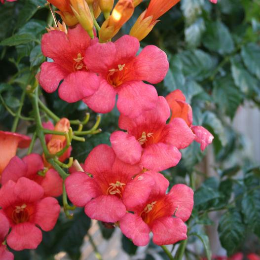 C'est une liane généreuse qui aime le soleil et se pare tout l'été de superbes trompettes rouges d'une rare intensité. Un feuillage vert foncé franc met en valeur des fleurs généreuses rouge rubis. Cette plante grimpante n'est pas envahissante, elle reste bien compacte et présente une floraison groupée et abondante.