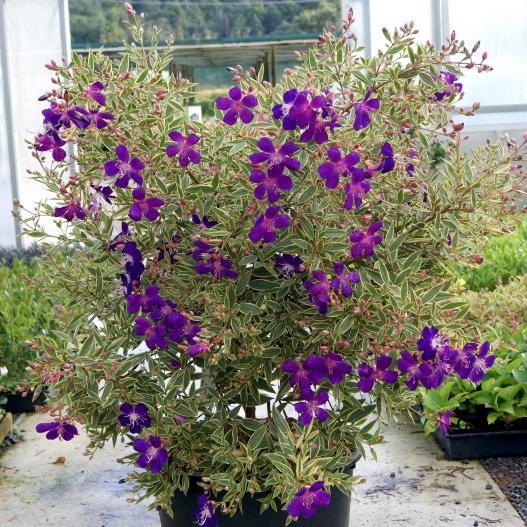 Le tibouchine Blaze of Glory illumine le jardin avec son feuillage vert bordé de crème. De la fin de l'été jusqu'en automne, et même en hiver dans les climats doux, il séduit avec ses fleurs d'un violet intense contrastant avec un feuillage velouté vert foncé. Les grands boutons roses ajoutent une touche unique. Idéal en pot ou en pleine terre, il préfère les emplacements ensoleillés à l'abri du gel pour une touche de couleur élégante et exotique. Plantez-le en pot dans les régions aux hivers froids. Sol bien drainé et fertilisation annuelle recommandés. Une beauté persistante et frappante pour tout jardin.