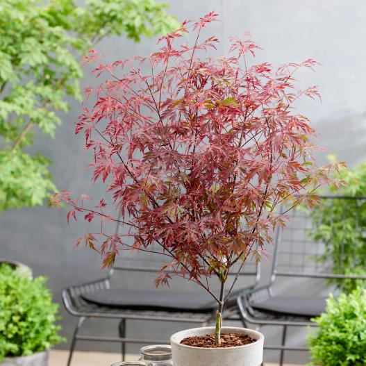 L'érable du Japon Royal Garnet vous émerveillera à chaque saison. Dès le printemps, ses nouvelles feuilles se parent d'un rouge grenat resplendissant nuancé par quelques touches de vert. À l'automne, une métamorphose opère et l'érable se transforme en une flamme ardente, avec même des touches bleuâtres surprenantes. Sa croissance débute avec une silhouette verticale, mais au fil des années, il s'étend et prend de l'ampleur, avec une ramification harmonieuse. Avec son magnifique feuillage aux couleurs changeantes, Royal Garnet est un érable qui fera rayonner sa splendeur sur votre jardin. Protégez-le des courants d'air froid.