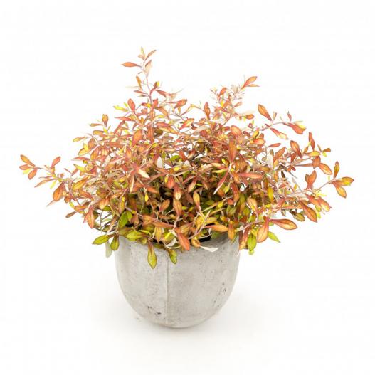 Avec son feuillage qui attire l'œil, le corokia Welsh Whiskey rappelle les nuances ambrées d'un bon whisky. Ses feuilles allongées offrent un brassage de couleurs, passant du jaune au vert et à l'orange, tandis que leur face inférieure scintille en blanc-argenté. Compact, il déploie sa beauté sur une surface de seulement 50 cm de côté, faisant de lui l'invité idéal pour la terrasse ou l'intérieur. Offrez-vous un moment de délice et d'émerveillement avec le corokia Welsh Whiskey, l'élixir doré de votre jardin.