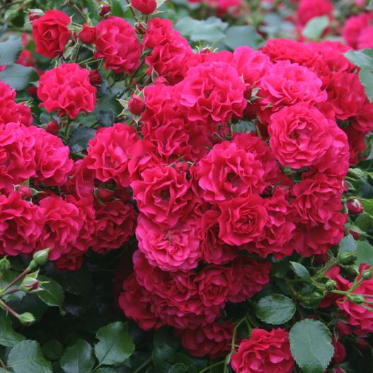 Ce vrai rosier couvre-sol déroule son tapis de fleurs rouges tout l'été. Il allonge ses branches remplies de feuilles vert foncé, formant un tapis de 30 cm de haut capable de couvrir talus, murs, pots et bacs.